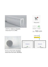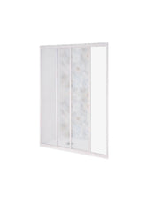 Profilo in PVC bianco Pastello. Pannello in Acrilico, spessore 1,8mm, effetto " Guazza". Reversibile, apertura scorrevole laterale. Riducibilità dei binari di scorrimento attraverso l'ausilio di un seghetto. Abbinabile a parete fissa 01512C